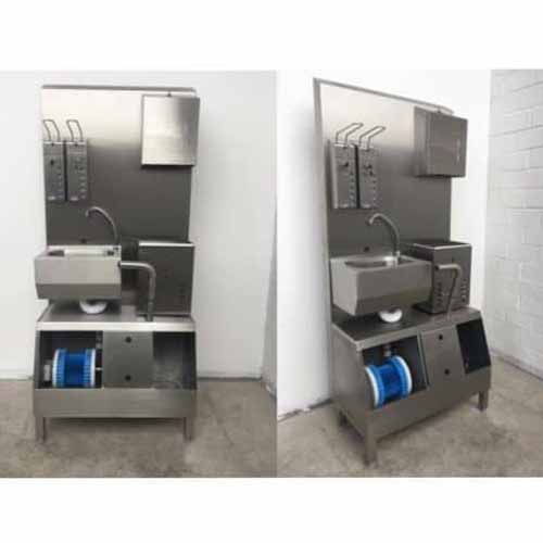 Centru de Igienă Pe un apărător rezistent la stropire sunt localizate următoarele componente ușor de utilizat, cum ar fi *un dozator din oțel inoxidabil care se poate încuia pentru hârtie pliată câte un dozator din oțel inoxidabil care poate fi încuiat pentru săpun și dezinfectant „Este posibilă curățarea antebrațelor conform USDA.”