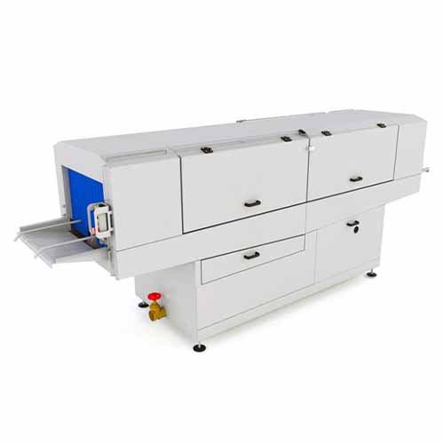Întregul sistem este construit din plăci și profile solide (oțel inoxidabil .Tunelul de spălare poate fi înclinat în două părți la stânga și la dreapta, oferind acces spațios la interior. Transportul cu cutii se realizeaza printr-un lant de plastic. Conductele de spălare sunt echipate cu un număr mare de duze. În zona de clătire, lăzile sunt clătite cu apă curată. Arcul de clătire este conectat direct la rețeaua de apă.